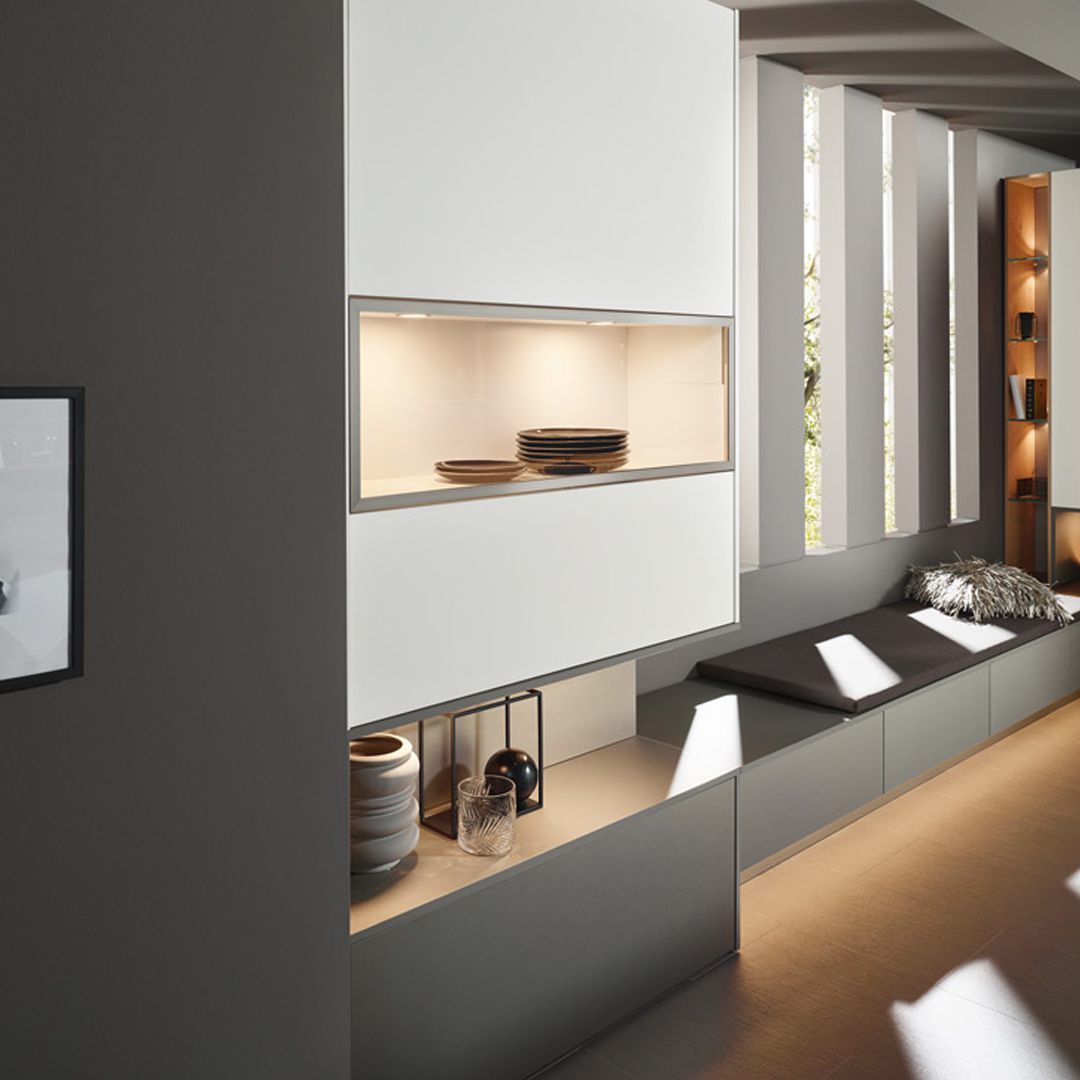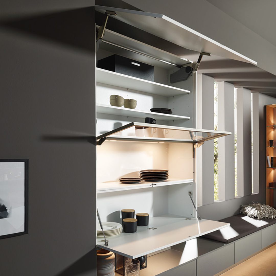 Adina-Felina-Franka ist ein geselliger Ort zum Wohlfühlen. Hier kommen vor allem die Details zum Vorschein. Die unsichtbaren Klappenbeschläge mit Glasrahmen machen aus einem unscheinbarem Schrank ein funktionales „Schmuckkästchen“.