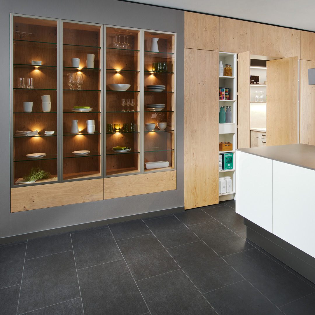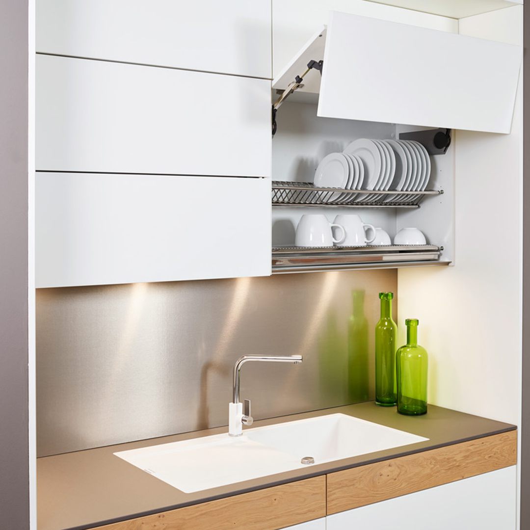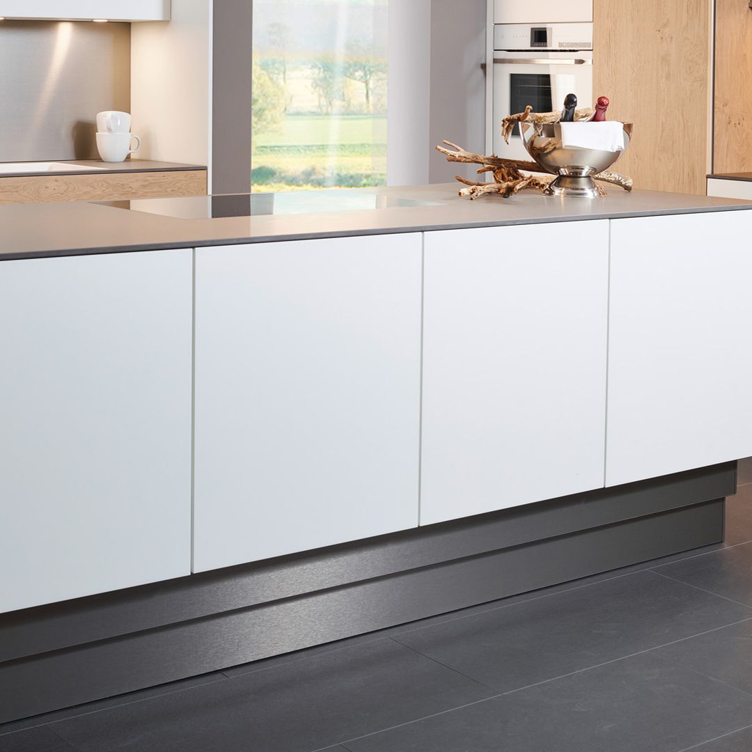 Fronten: Weiß matt, Asteiche kalkweiß.Korpus: WeißKompaktarbeitsplatte: Hamilton-Stahl supermatt