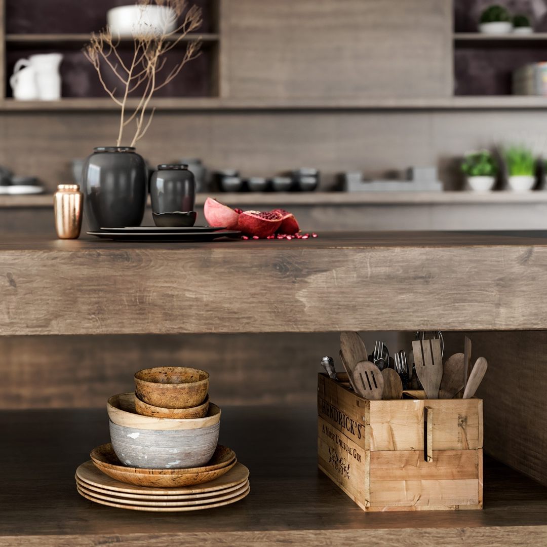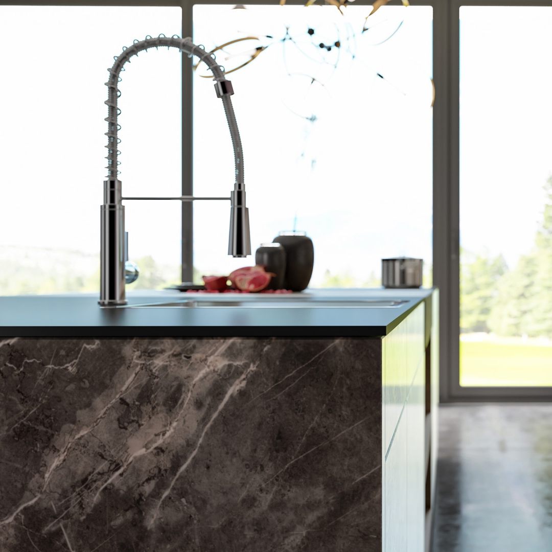 Fronten: marmo romano, Wildeiche silbergrau.Kompaktarbeitsplatte: Edelstahl