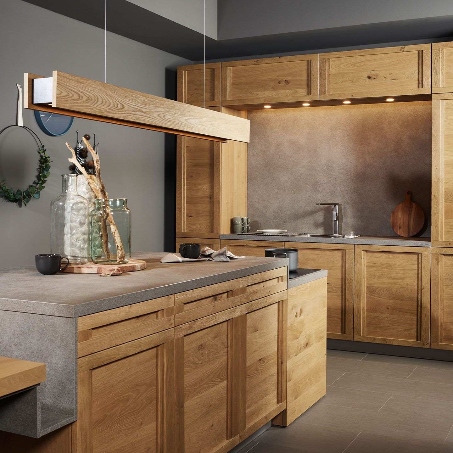 Die rustikalen Fronten lassen den Raum wärmer wirken und laden zum Verweilen in der Küche ein. Die Pendelleuchten sind dazu perfekt abgestimmt. Mit AMALIA erzeugen Sie ein warmes Wohngefühl.