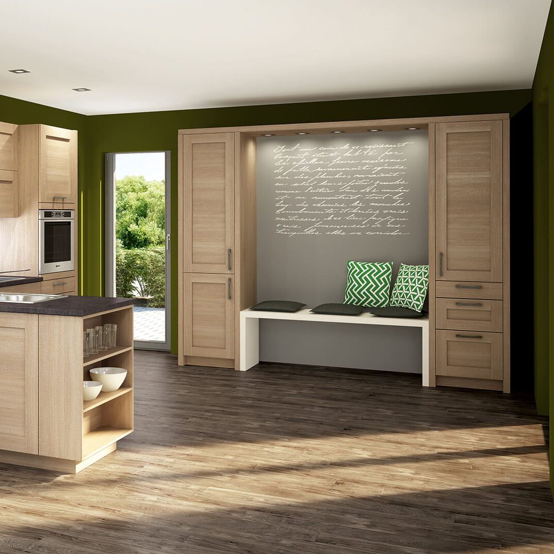 Fronten: Eiche BordolinoKorpus: Eiche BordolinoQuarzstein-Arbeitsplatte: braun antik