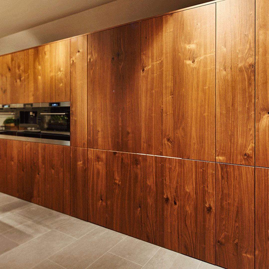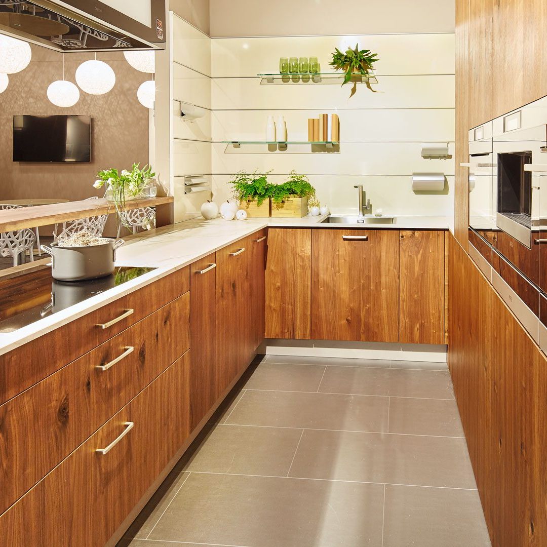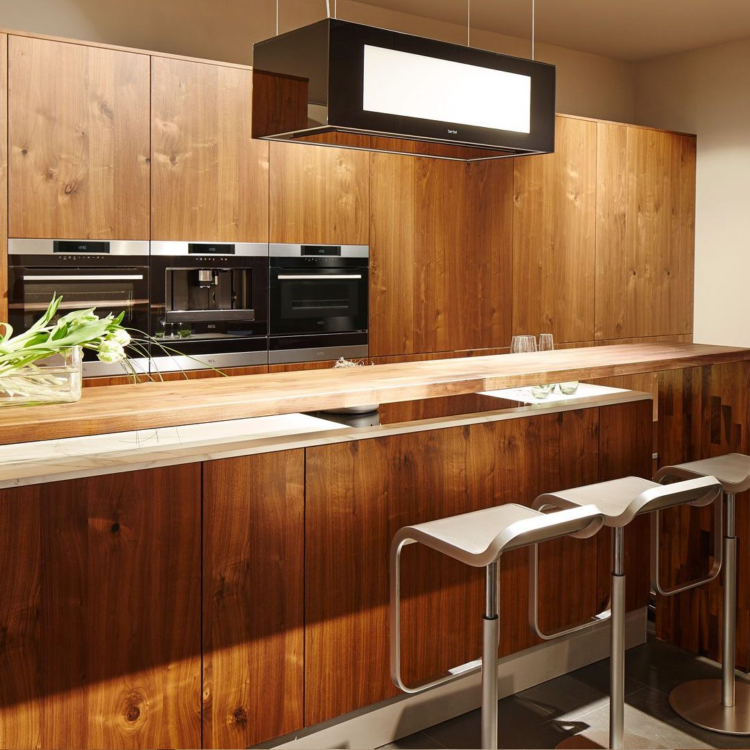 Fronten: Nussbaum antikKeramik-Arbeitsplatte: Carrara weißTresen: Nussbaum USA