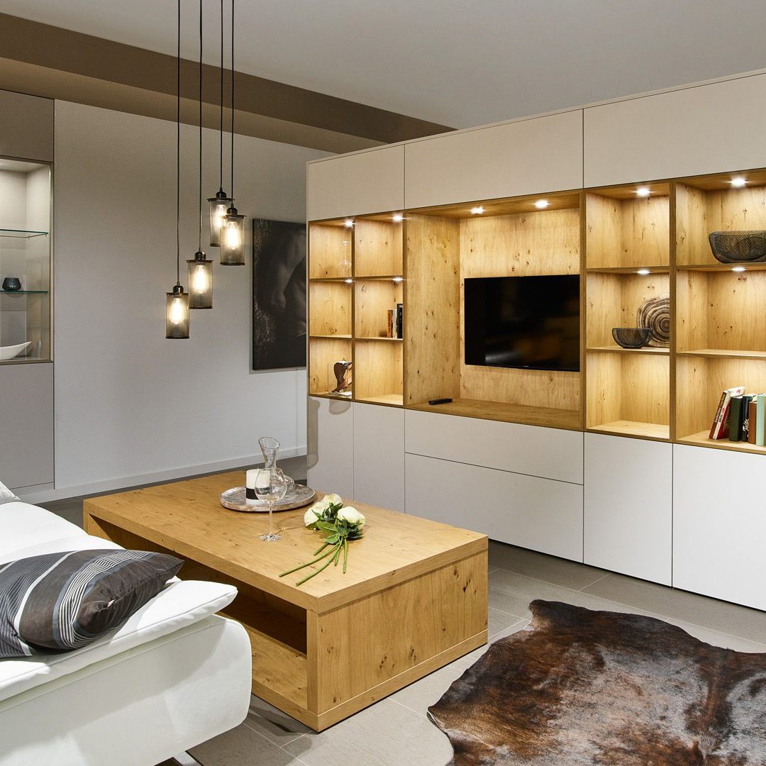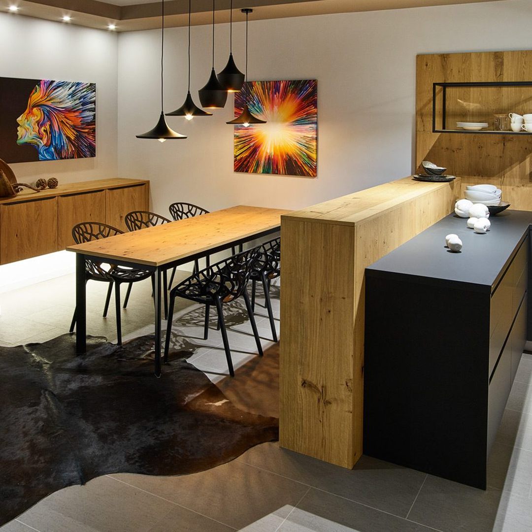 Fronten: Weiß matt, Hamilton-Stahl supermatt oder Asteiche kalkweiß. Korpus: Weiß oder cobaltgrau Kompaktarbeitsplatte: Hamilton-Stahl supermatt.
