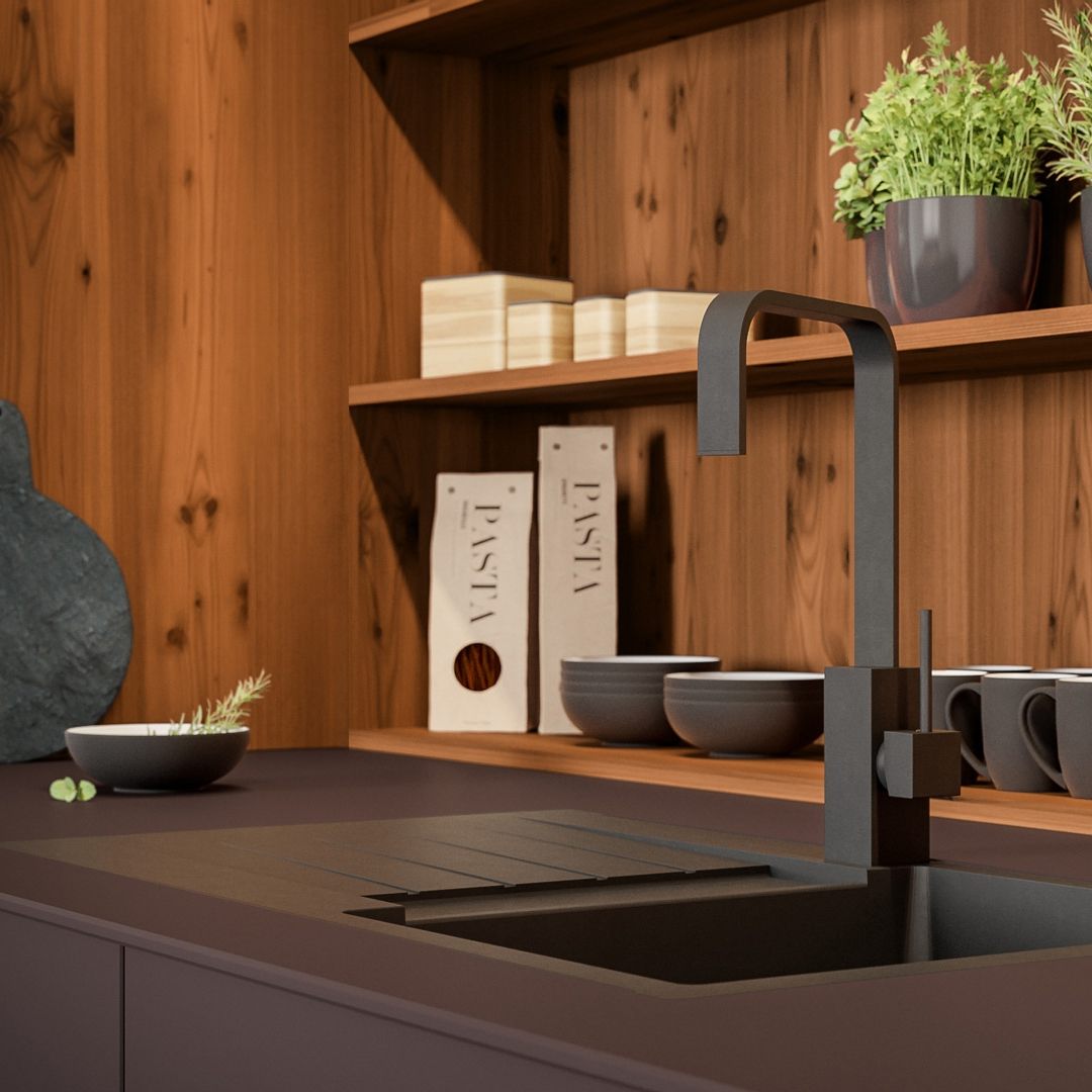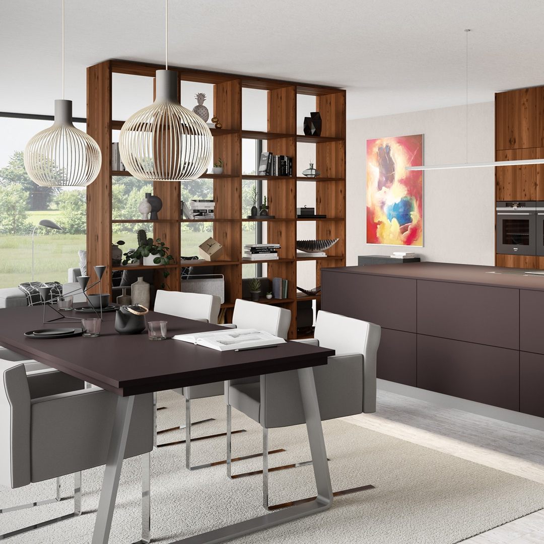 Fronten: cacao supermatt, Nussbaum antikKompaktarbeitsplatte: cacao supermatt
