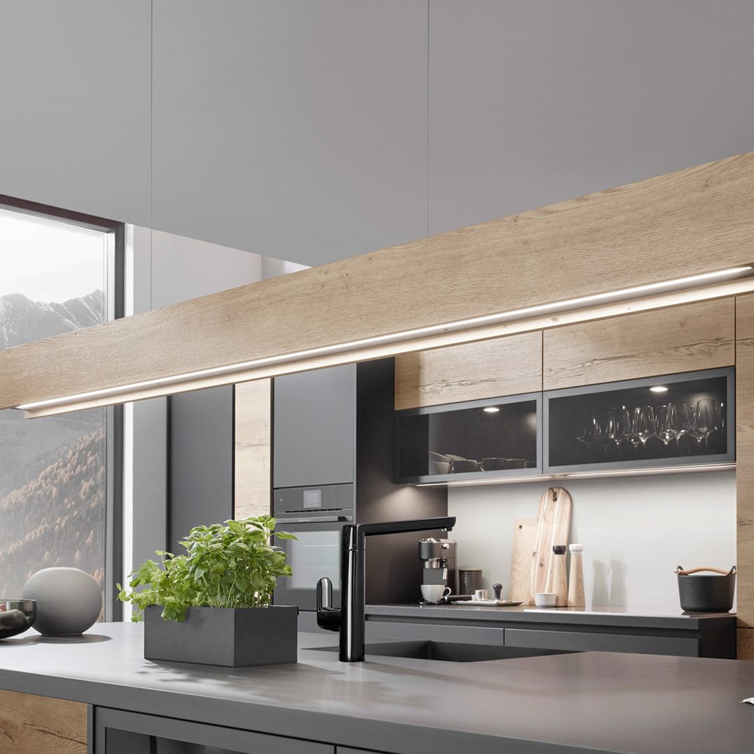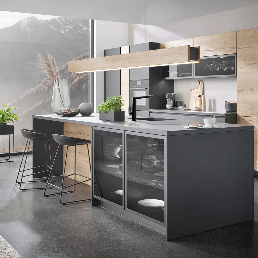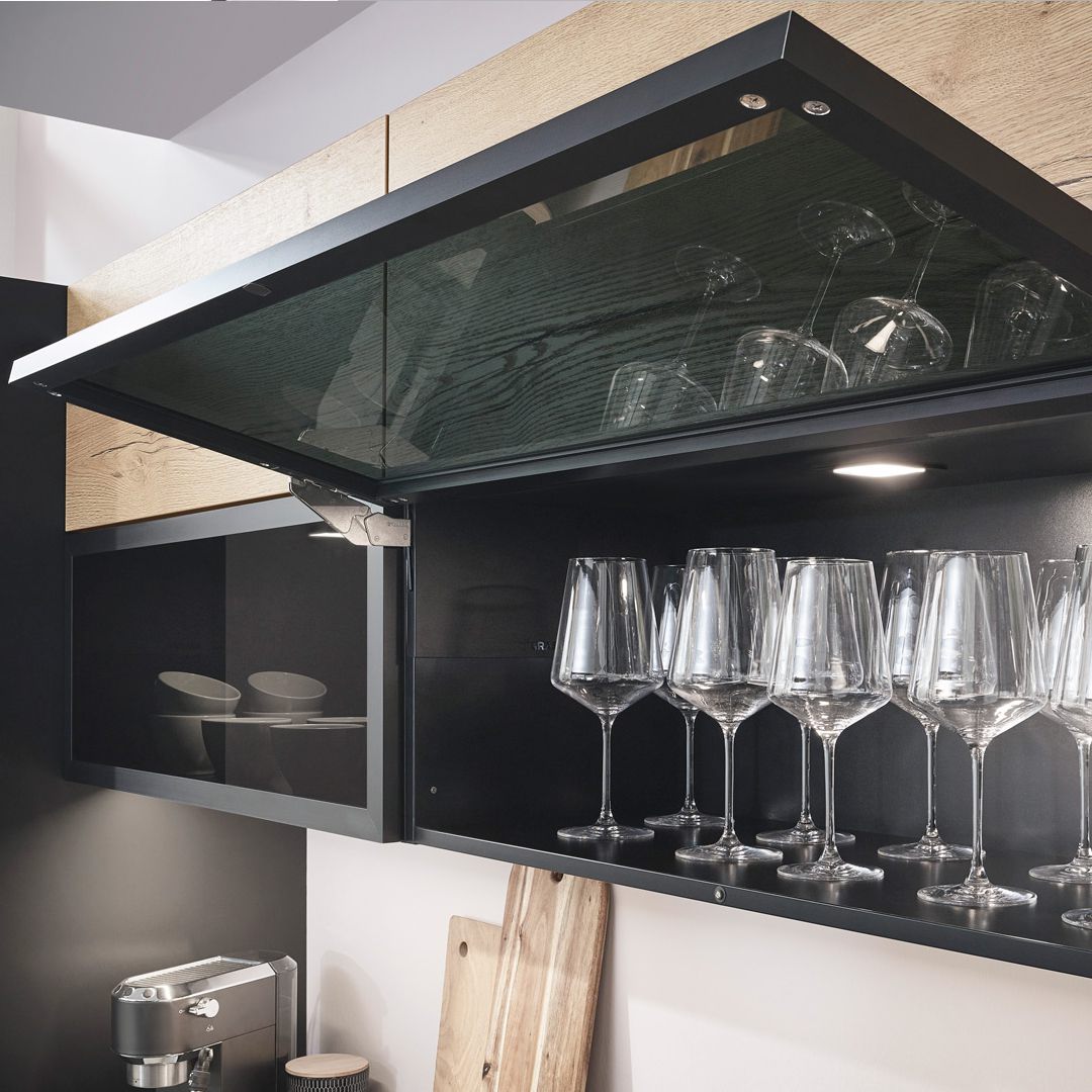 Der Kontrast von mattschwarzen Fronten und heller Eiche-Optik verwandelt die Küche in eine moderne Zeitgeist-Oase. LARA-LANA bietet viel Stauraum und Dekorationsmöglichkeit.