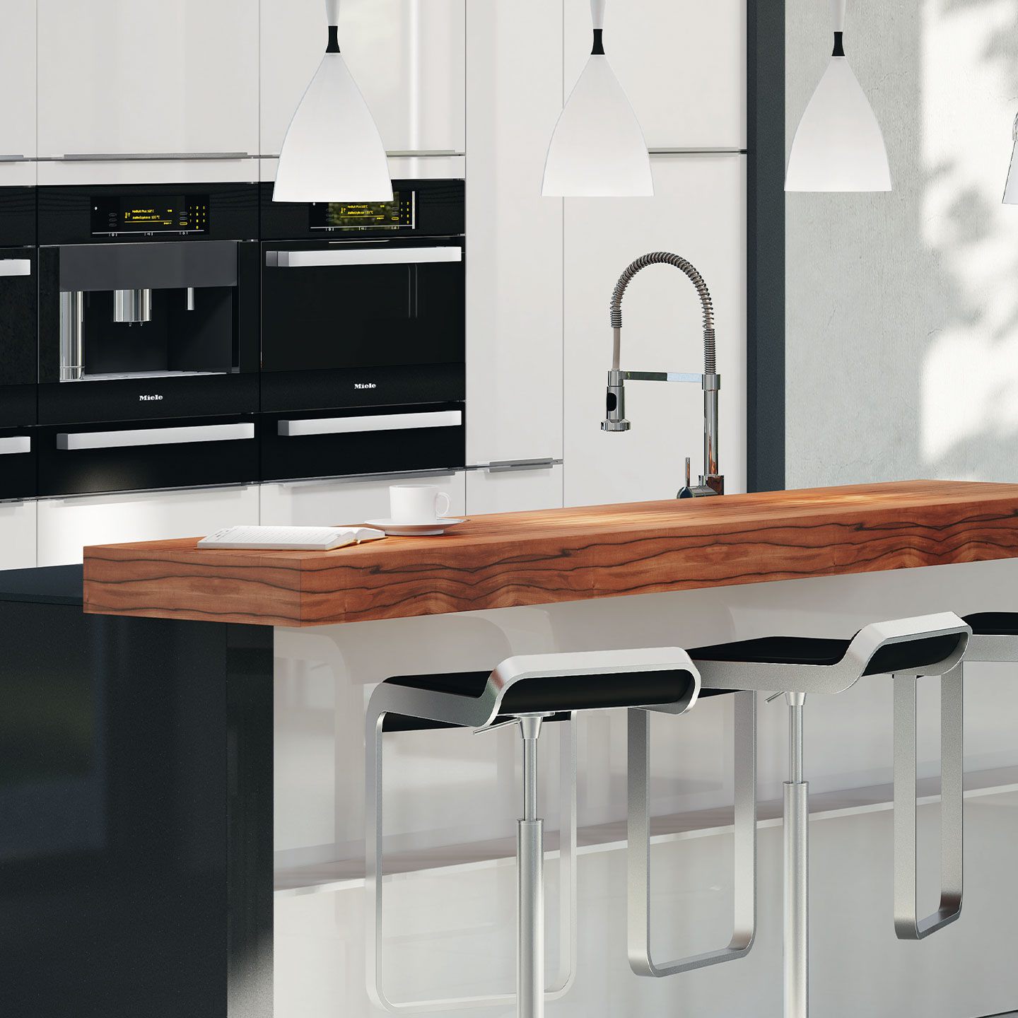 Schwarz trifft auf Weiß, unterstützt von einer Tischplatte aus Indischem Apfel. Diese Kombination verleiht der Küche eine moderne Ruhe. Der Glanz verleiht diesem Ort mühelose Eleganz. MAJA begeistert durch Einfachheit und Individualität.
