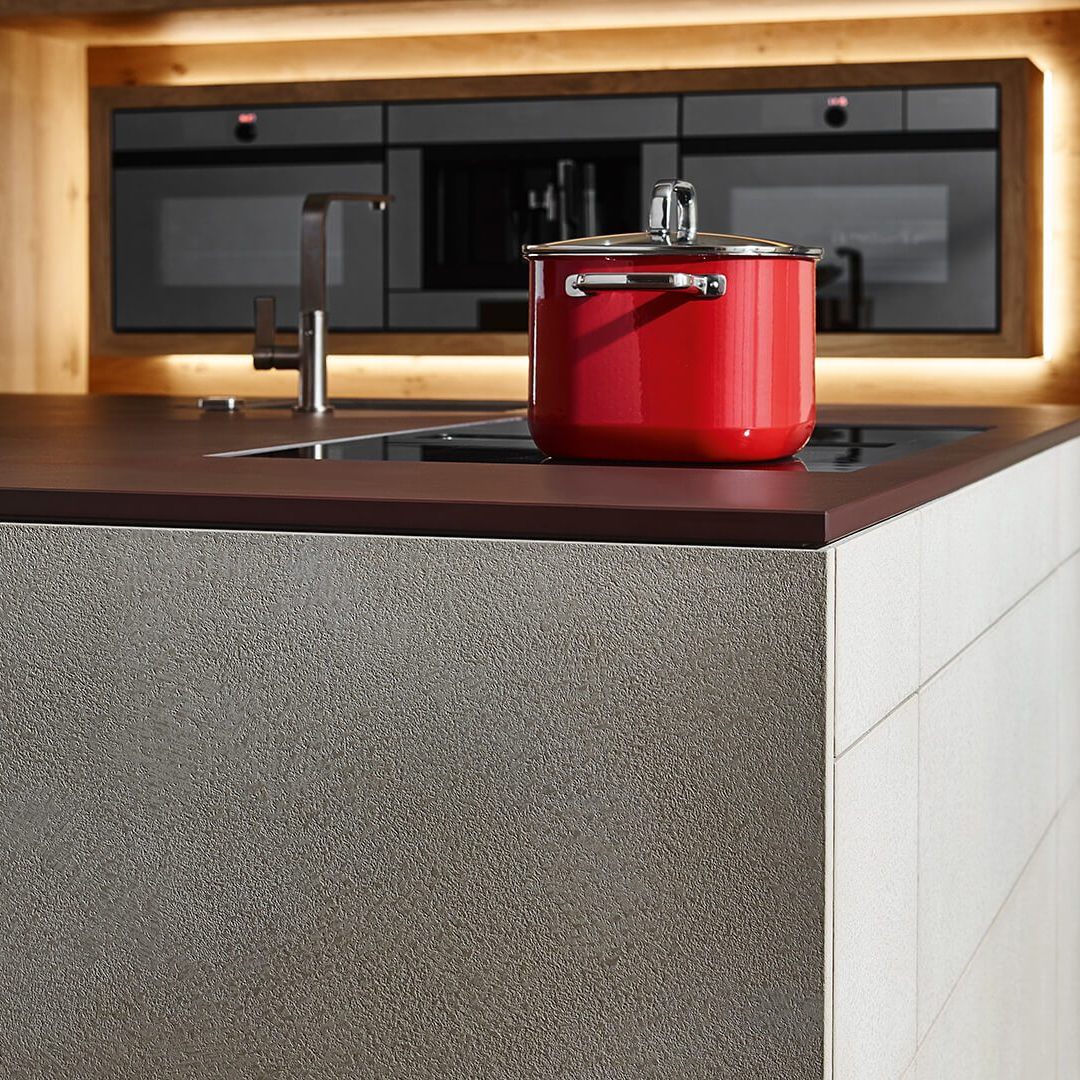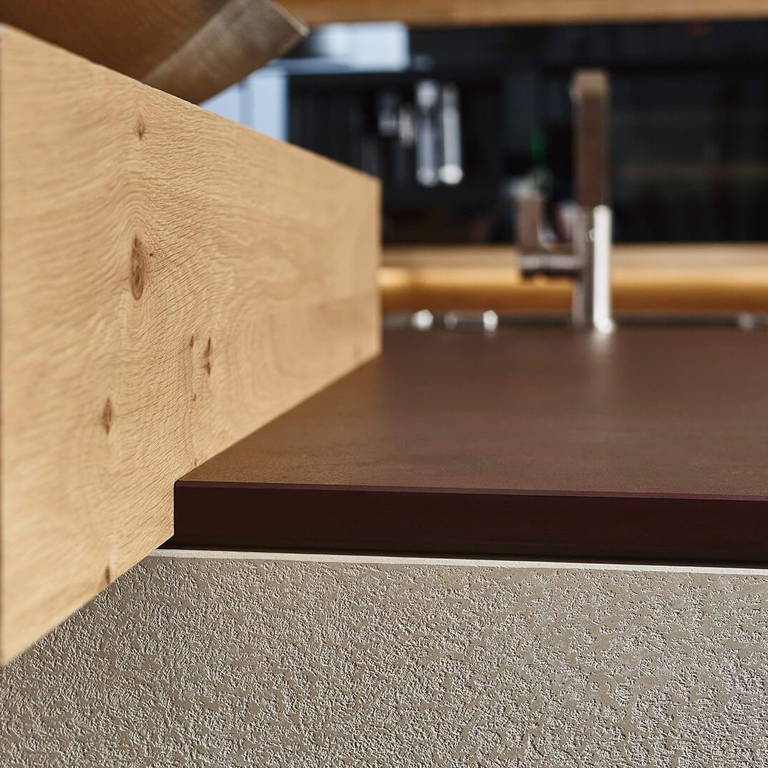 Dieses Modell überzeugt durch sanfte, einladende Farben. Granitgraue und sandfarbige Fronten zeigen im Zusammenspiel mit rustikaler, heller Eiche, wie schmeichelnd warm unterschiedliche Materialien miteinander interagieren.