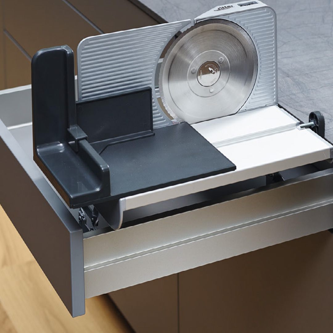 Funktion im Kasten: Allesschneider macht sich nach getaner Arbeit klein. Elektrische Geräte stören oft die Optik und beim Saubermachen. Dieser platzsparende Allesschneider verschwindet nach getaner Arbeit im Nu zusammengeklappt im Schiebekasten.