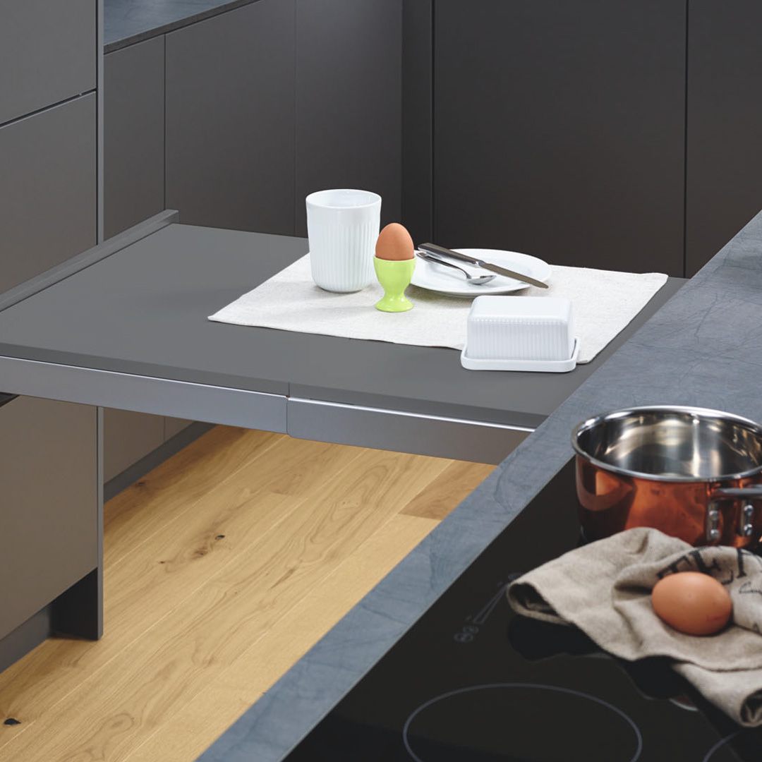 Ob schnelles Frühstück, einen Vino im Stehen, oder ein Extraplatz beim Kochen und Backen: der Auszugstisch schafft mehr Fläche für jede Küchengröße und ist mit einem Griff parat.