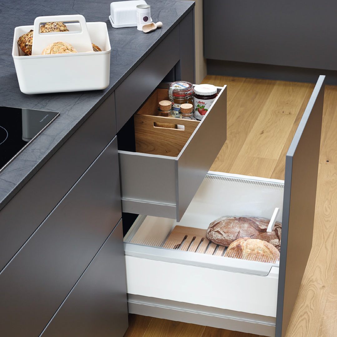 Lebensmittelauszüge müssen vor allem eins sein: Hygienisch, leicht zu säubern, praktisch in der Anwendung und schön anzusehen. Ein Unterschrank, 2 Auszüge, ein Hochgenuss. Innenauszug und Pantry Box unter einem Dach.