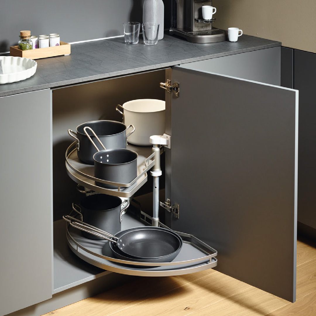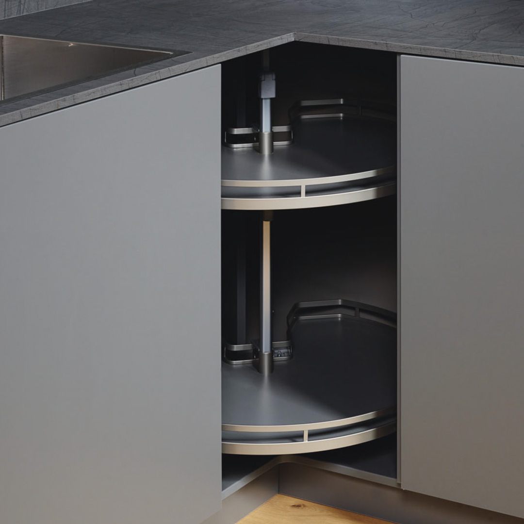 Stauraumausnutzung bis in die letzte Ecke. Der Halbkreisdrehboden macht es möglich. Die unabhängig voneinander zu bewegenden Halbkreis-Drehböden verhindern lästiges Suchen auf engem Raum mit viel Übersicht.