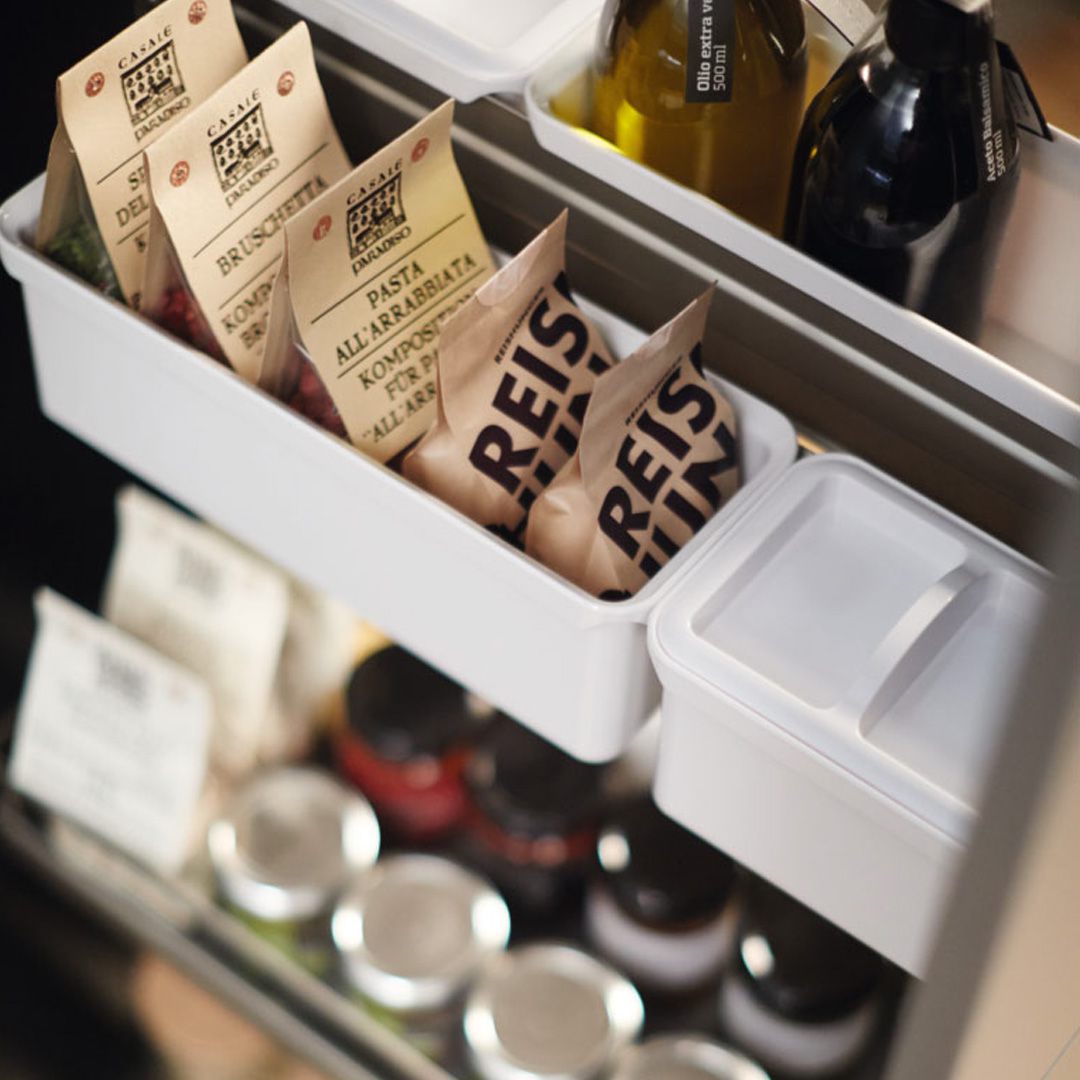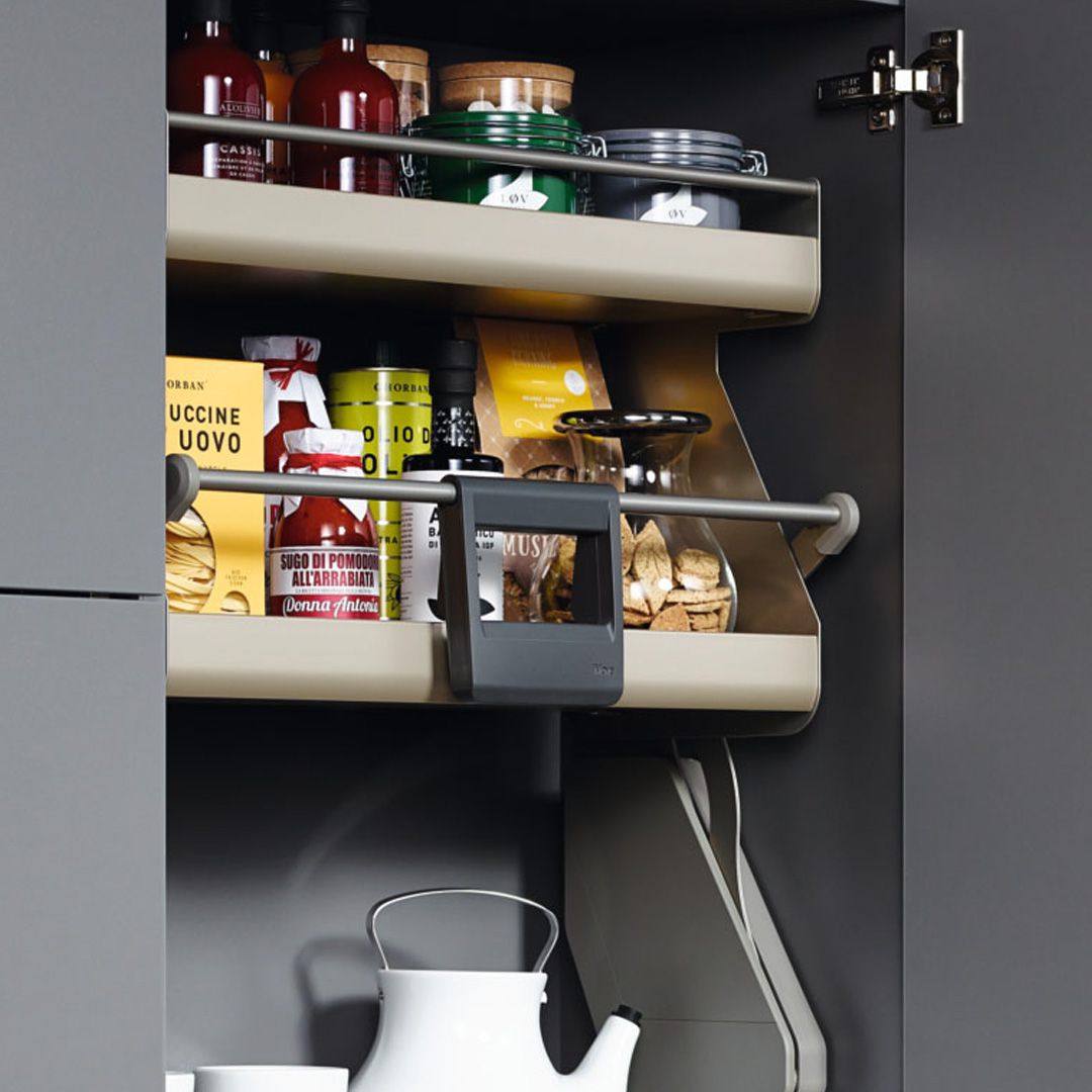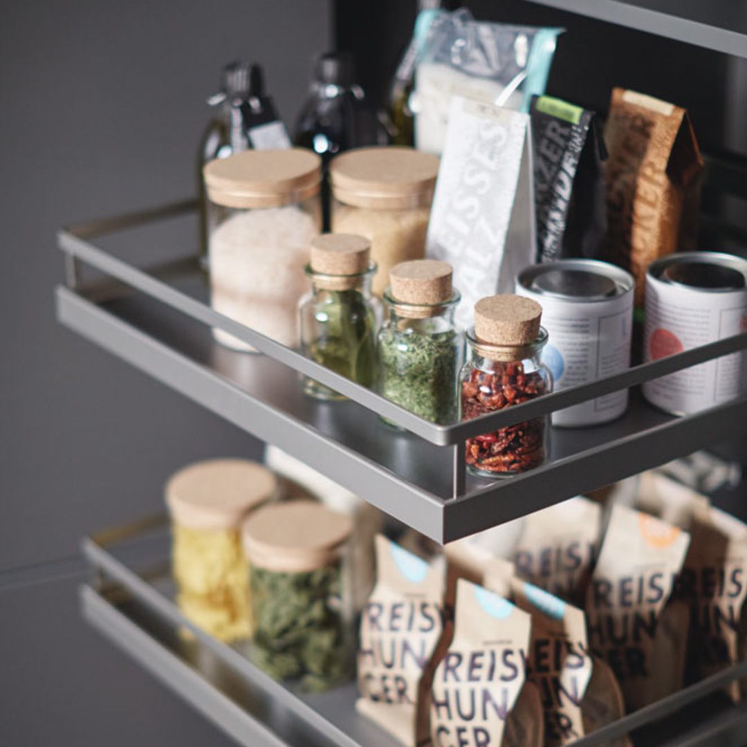 Mit seinen höhenverstellbaren Tablaren und der beidseitigen Bedienbarkeit erfüllt das Vorratsschranksystem jeden Organisationswunsch. Mit Durchblick und verschiedenen Schalen organisieren sich die Staugüter fast von selbst.