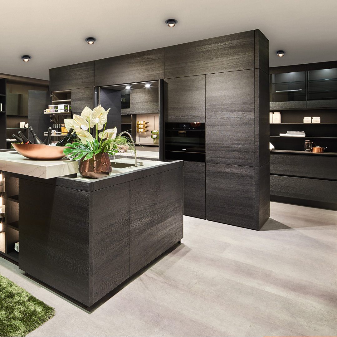 Diese offene Küche lässt keine Wünsche offen. Eleganz und hochentwickelte Technologien lassen trotz offener Raumstrukturen ausreichend Rückzugsorte. Warme Texturen und Lichtinszenierungen fügen maßgeschneidert Wünsche an die persönlichen Raumanforderungen zusammen.