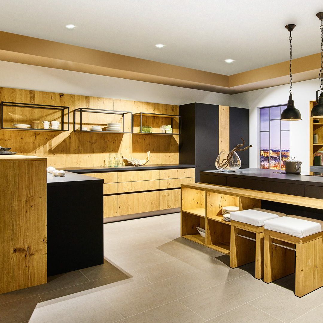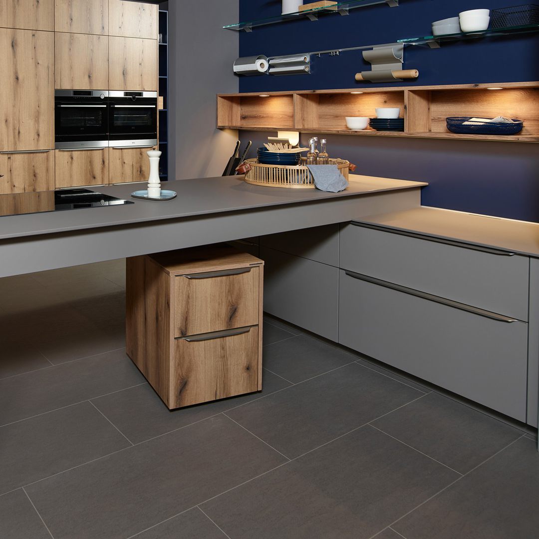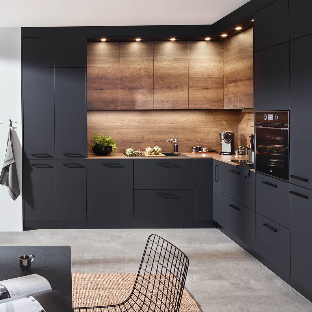 Der Kontrast von mattschwarzen Fronten und heller Eiche-Optik verwandelt die Küche in eine moderne Zeitgeist-Oase. LARA-LANA bietet viel Stauraum und Dekorationsmöglichkeit.