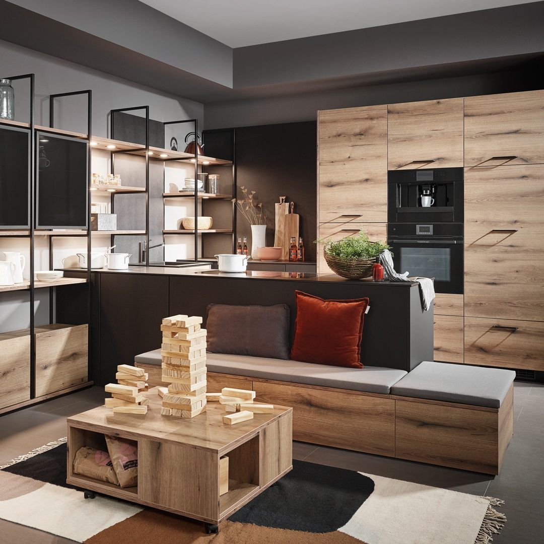 Lebendige Holzoptik kombiniert mit loftigen Regalwänden. Ein besonderer Hingucker ist die über Eck verlaufenden Küchenzeile, die in einen Loungebereich mündet. LANA-FIORA bringt Menschen zusammen und überzeugt durch ihr modern-urbanes Design. Ein wahres Schmuckstück.